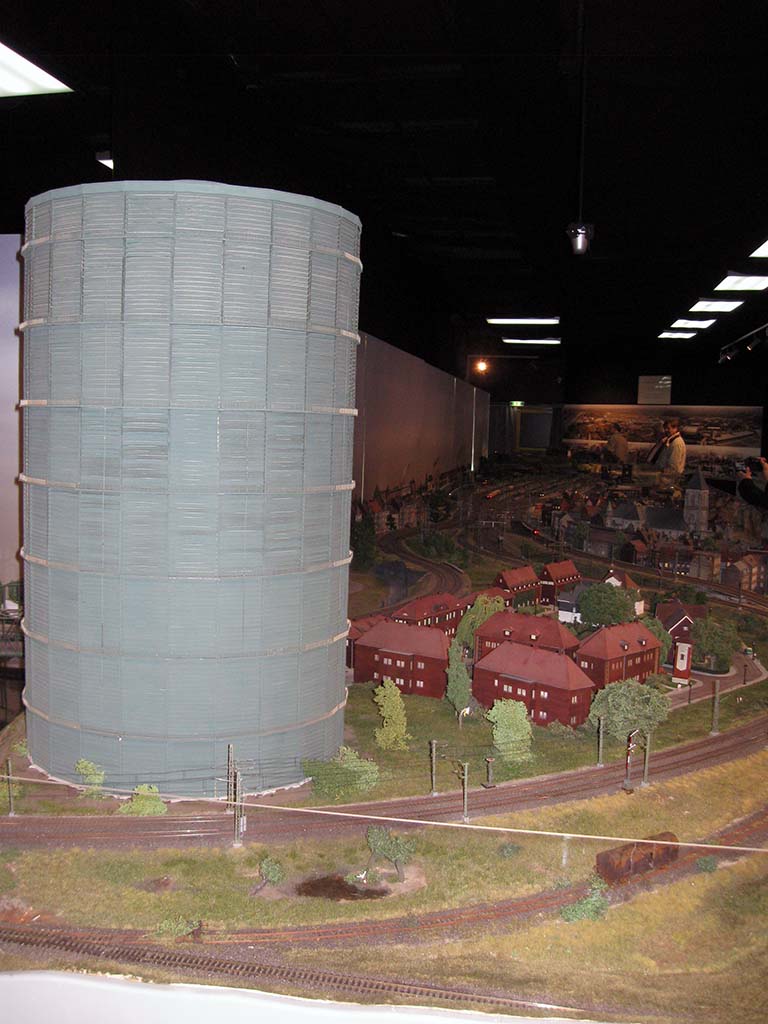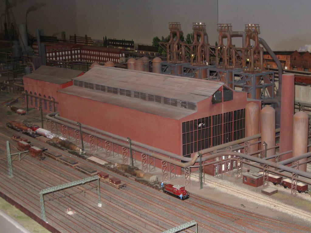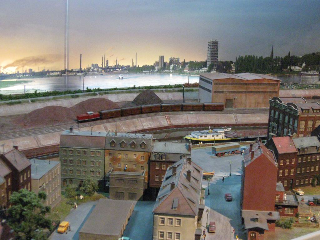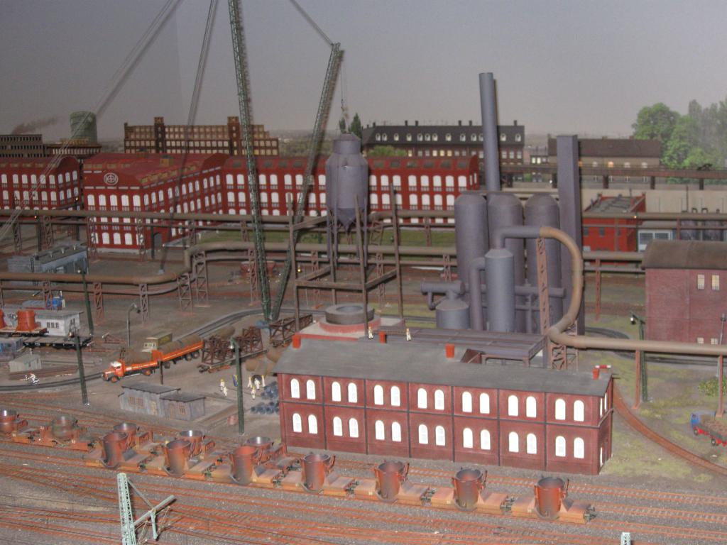 Oberhausen es una ciudad de Renania del Norte-Westfalia, está situada en la Cuenca del Ruhr. Actualmente tiene unos 219.000 habitantes. No lejos del famoso gasómetro de Oberhausen y en la zona de ocio del Aquapak y del CentrO se encuentra la maqueta de la Miniaturwelt Oberhausen (o Modellbahnwelt Oberhausen). La maqueta serpentea sobre sí misma dentro de un local de 1500 metros cuadrados para realizar una réplica en miniatura de las líneas de la Cuenca del Ruhr, desde el puerto de Duisburgo a Oberhausen. La ambientación que yo pude observar era de los años de oro del transporte de coque, minería del carbón y trasiego de material entre los altos hornos y las fabricas de siderurgia. |