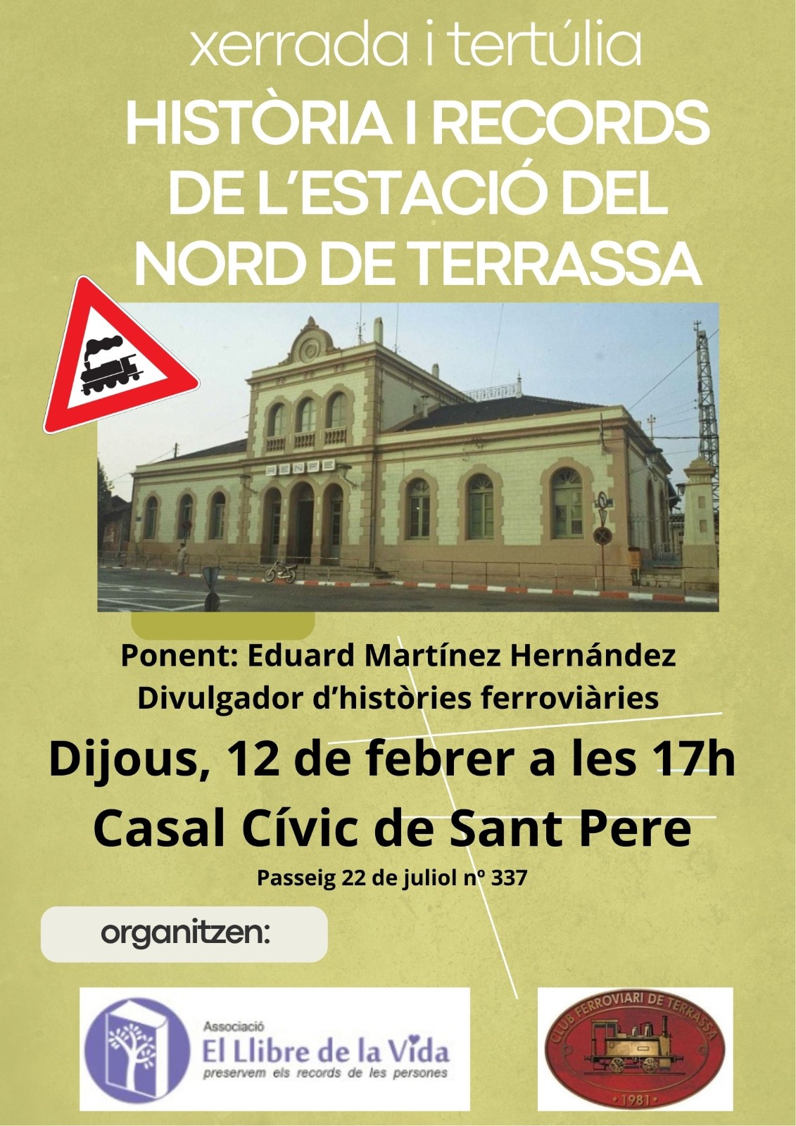 El proper dijous 12 de febrer de 2026 a les 17h, al Casal Cívic de Sant Pere, passeig 22 de juliol, 337, les entitats El llibre de la vida i el Club Ferroviari de Terrassa organitzen una xerrada tertúlia amb el títol “Història i records de l’estació del nord de Terrassa”, a càrrec d’Eduard Martínez Hernández, divulgador d’històries ferroviàries i soci del Club Ferroviari de Terrassa.