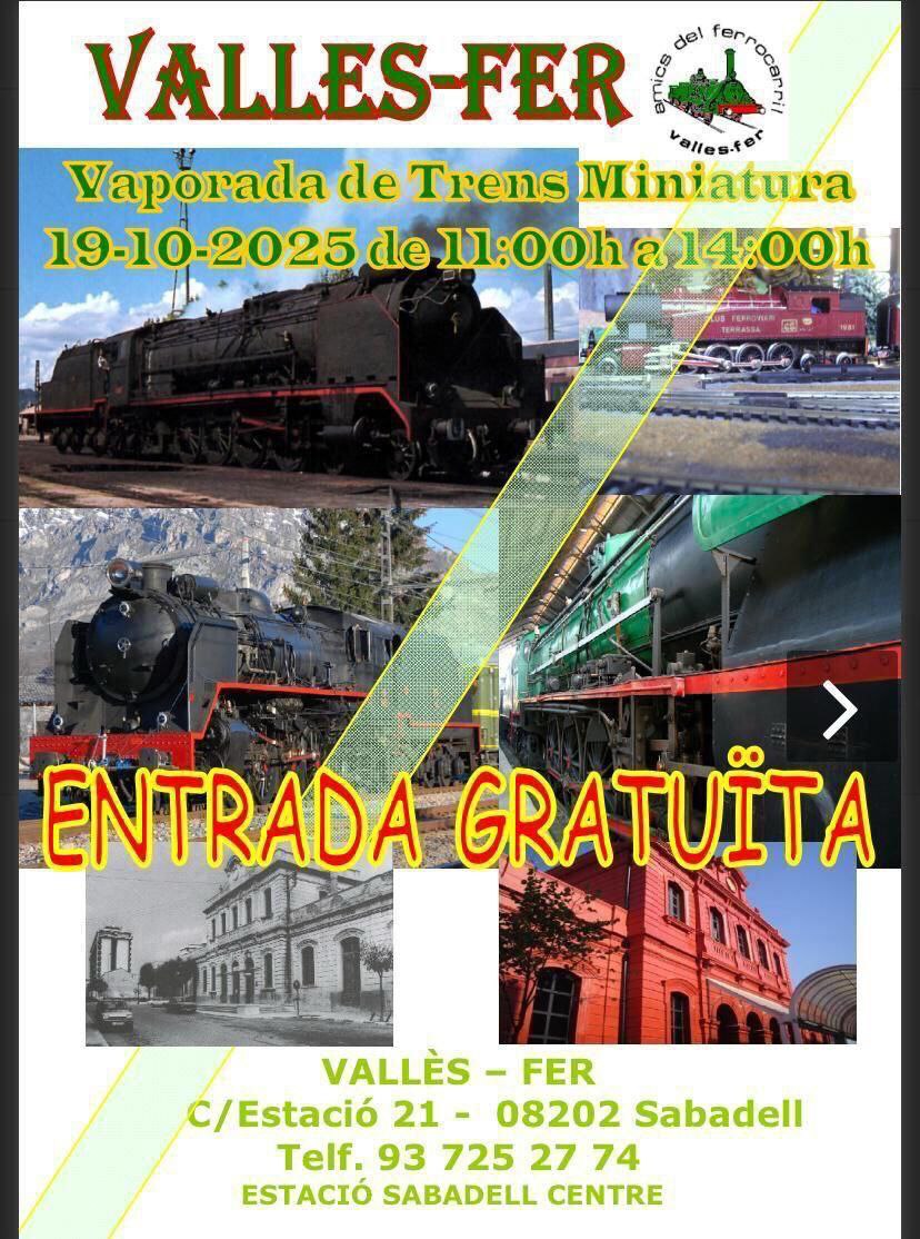 El proper 19 d’octubre de 2025 d’11 a 14 hores els amics de Vallès-Fer de Sabadell celebraran una vaporada de trens miniatura al seu local social.