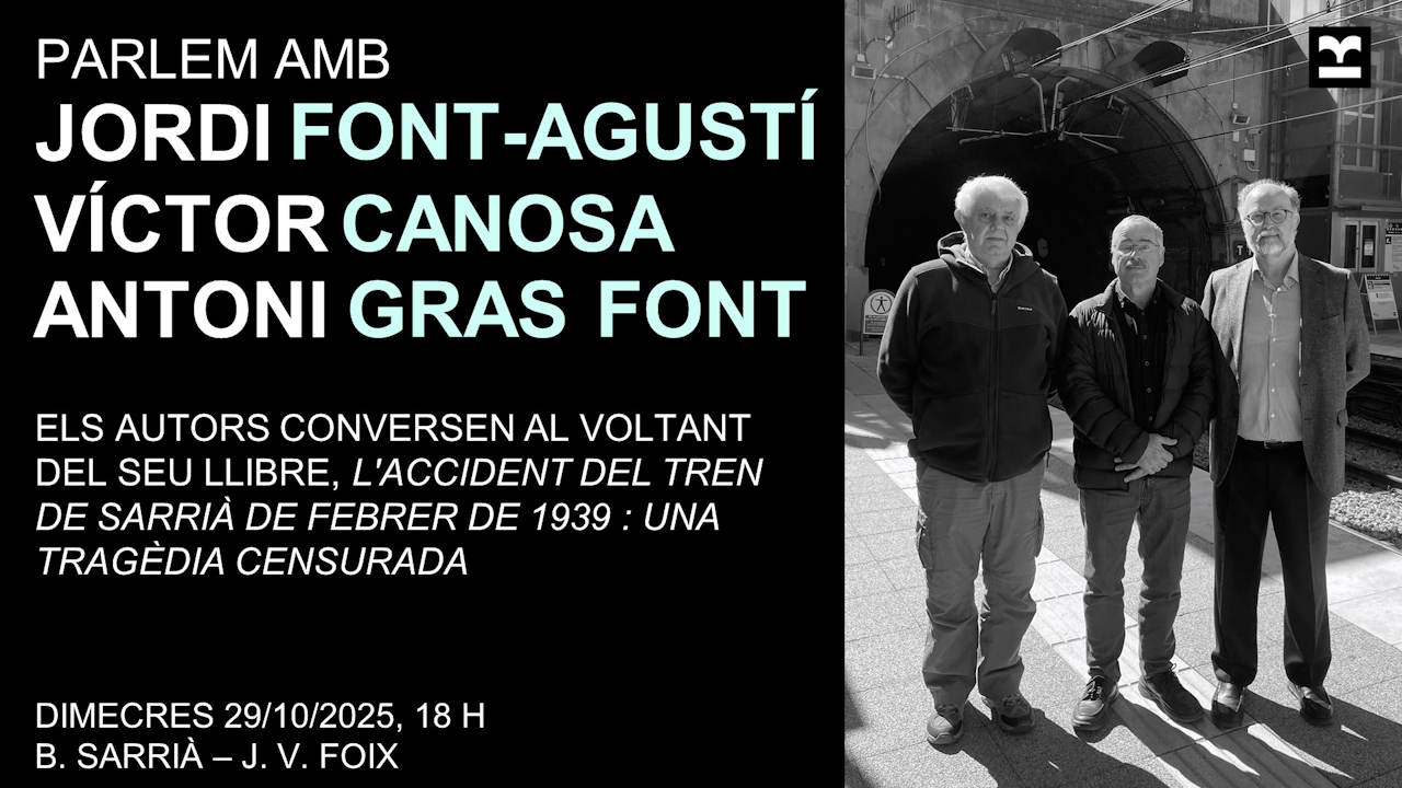 El proper dimecres 29 d’octubre de 2025 es realitzarà a la biblioteca J. V. Foix de Sarrià la presentació del llibre “L’accident del tren de Sarrià de febrer del 1939. Una tragèdia censurada” de Jordi Font-Agustí, Victor Canosa i Antoni Gras.