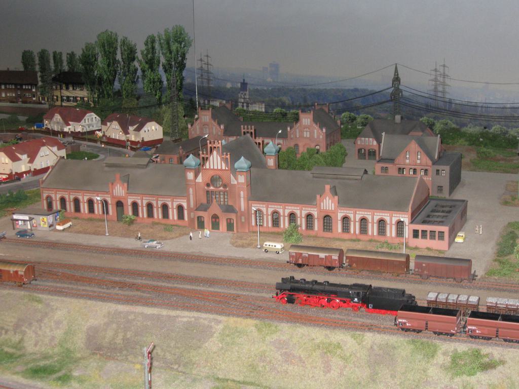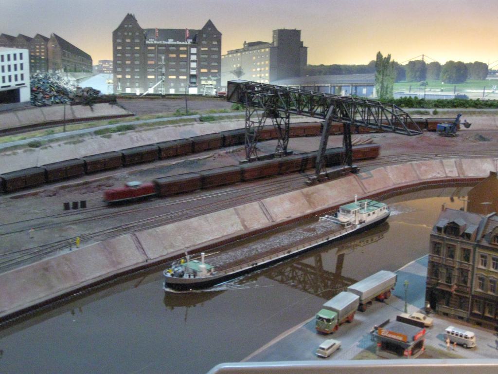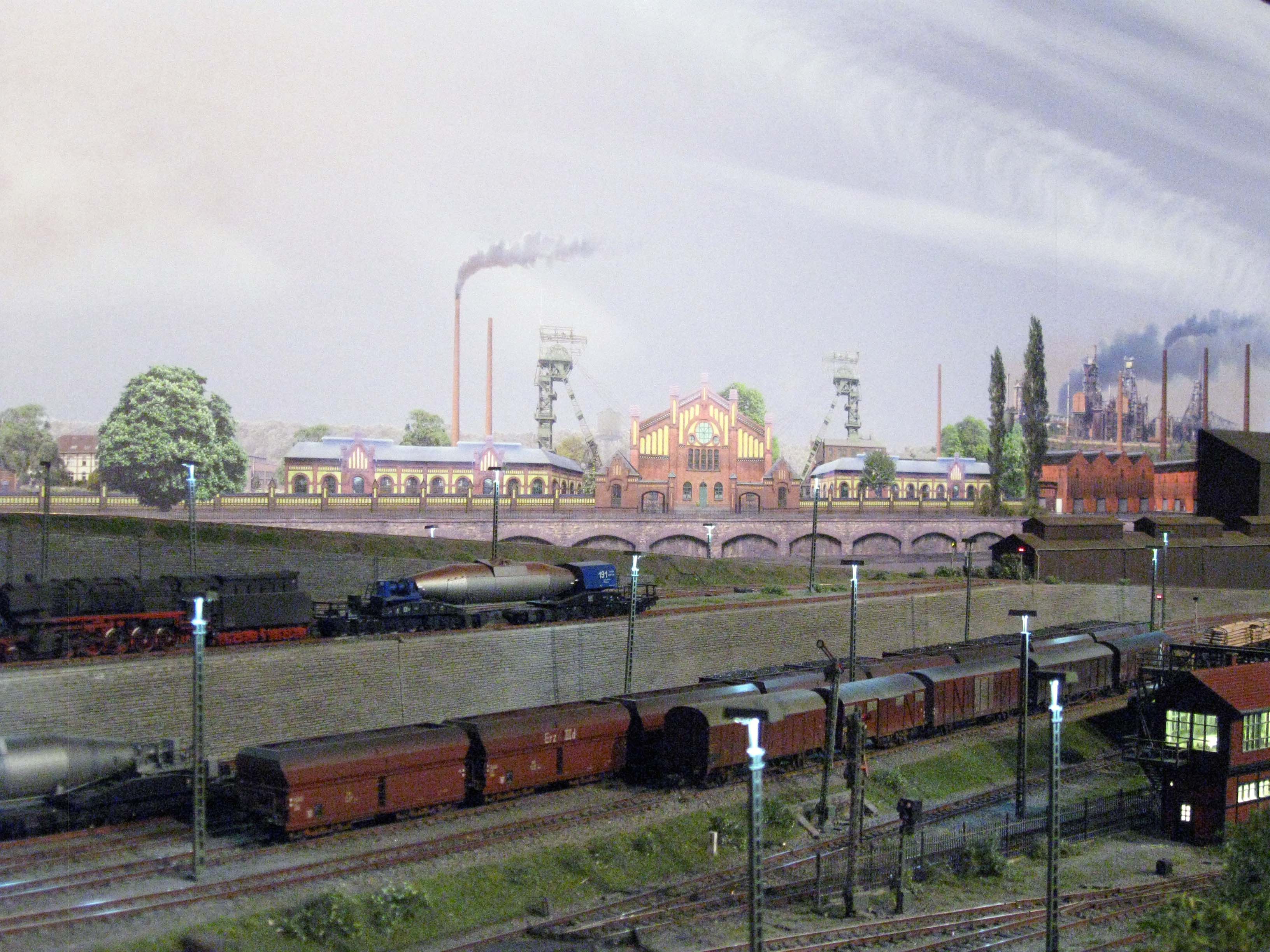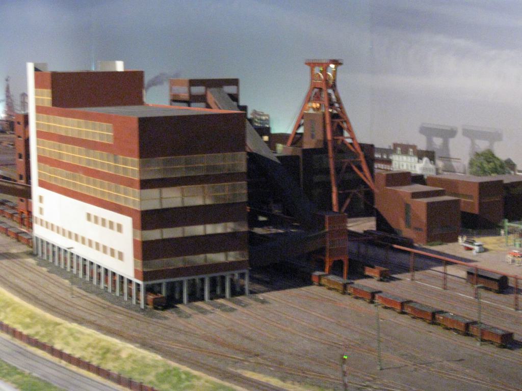 Oberhausen es una ciudad de Renania del Norte-Westfalia, está situada en la Cuenca del Ruhr. Actualmente tiene unos 219.000 habitantes. No lejos del famoso gasómetro de Oberhausen y en la zona de ocio del Aquapak y del CentrO se encuentra la maqueta de la Miniaturwelt Oberhausen (o Modellbahnwelt Oberhausen). La maqueta serpentea sobre sí misma dentro de un local de 1500 metros cuadrados para realizar una réplica en miniatura de las líneas de la Cuenca del Ruhr, desde el puerto de Duisburgo a Oberhausen. La ambientación que yo pude observar era de los años de oro del transporte de coque, minería del carbón y trasiego de material entre los altos hornos y las fabricas de siderurgia. |