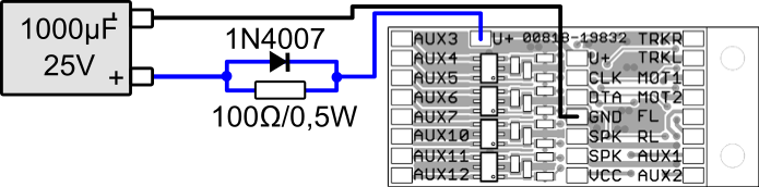 ESU 51958 PluX22El adaptador de 22 pines tiene los pads de soldadura en la parte del conector de la platina y viene con los 9 cables básicos hasta AUX2. Según el fabricante el polo positivo se tiene que soldar en el pad Cap+ y la masa en GND. Hay que recordar que en la mayoría de las platinas de 22 pines el descodificador se inserta en la cara que no hay componentes. Más información en el manual de usuario de las platinas de interfaz de ESU. |
